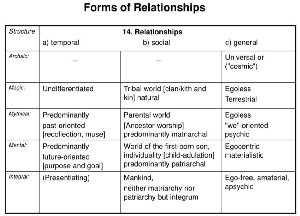 Gebser suggests that a new form of consciousness is starting to emerge, an integral or ‘Aperspectival consciousness’. He suggests that when a consciousness structure is starting to emerge it does not eradicate previous forms but integrates their positive attributes into the new form. Gebser delineates five structures of consciousness: Archaic, Magical, Mythical or Unperspectival, Mental or Perspectival and Integral or Aperspectival and in each new era the previous forms merged into the newer forms. The table below gives an overview of the characteristics of each consciousness structure.